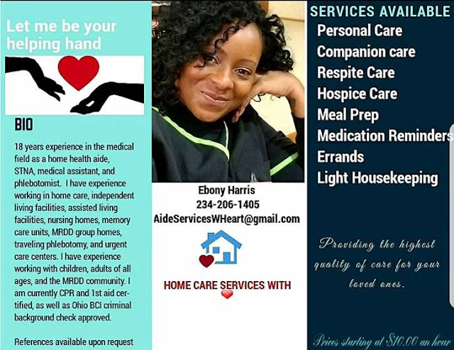Ebony has recently started her own home health care services as a private provider. Working in the medical field for approximately eighteen years, it comes to no surprise that a woman with her business savvy and mindset started doing for self. Her services include personal care, companion care, Hospice care, meal preparations, medical reminders, errands and light housekeeping.